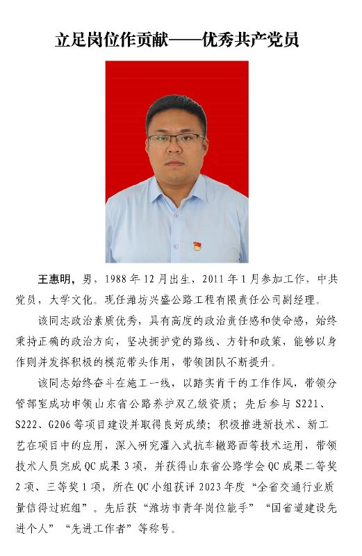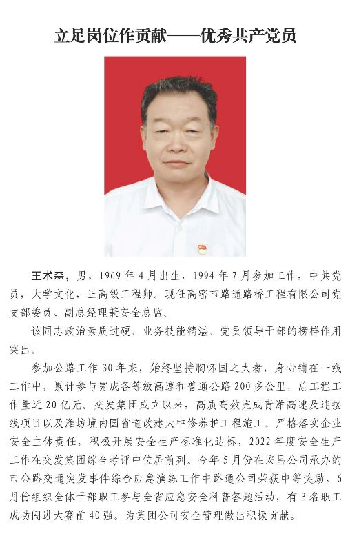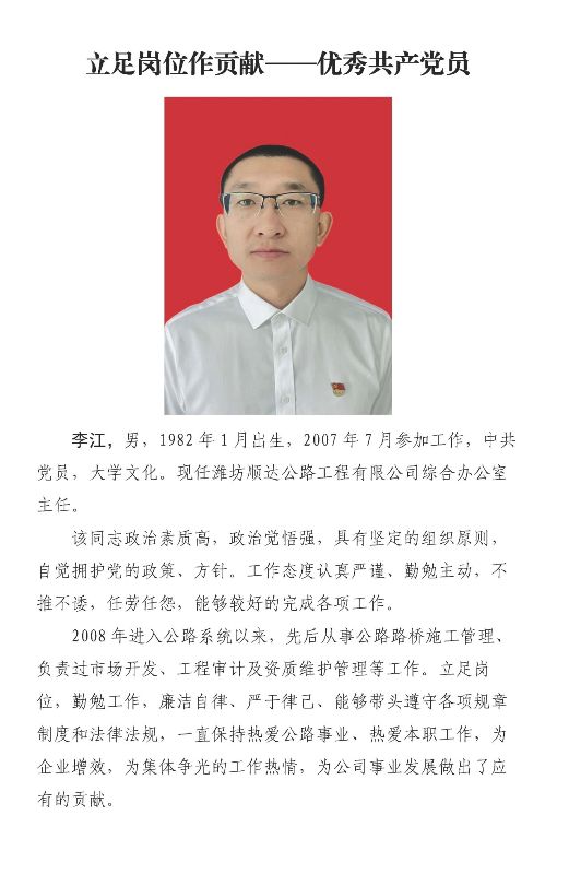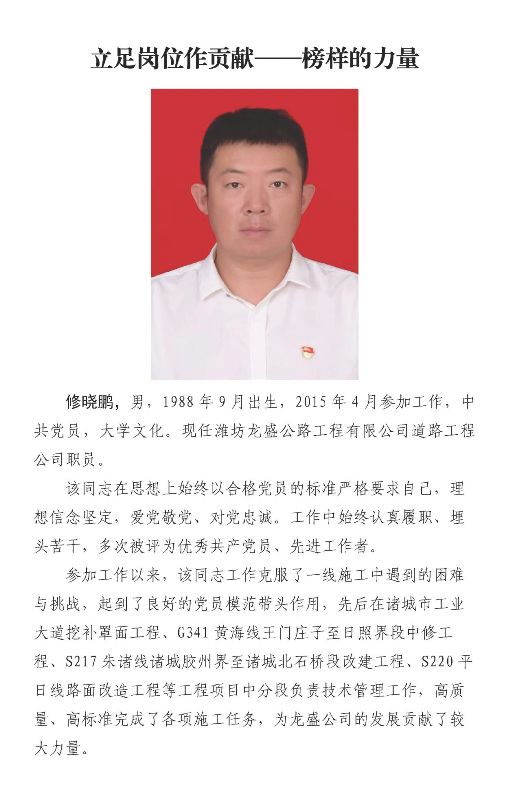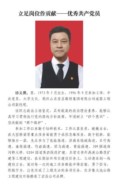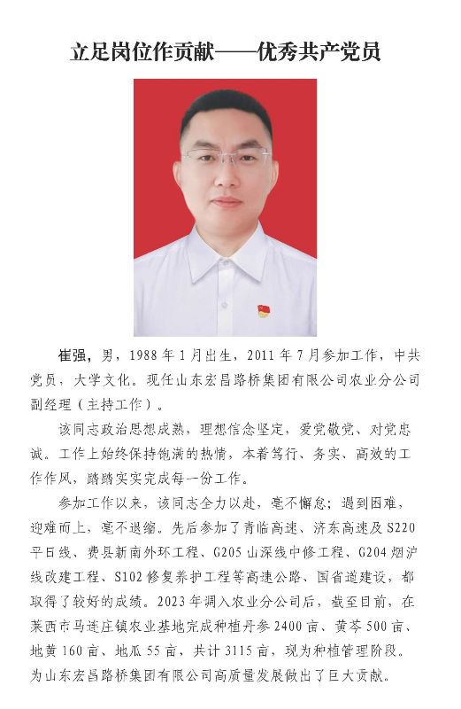 為深入貫徹黨的二十大精神,切實(shí)加強(qiáng)基層黨建工作,樹立標(biāo)桿典型,弘揚(yáng)奮斗精神,調(diào)動(dòng)公司全體干部職工的工作積極性和主動(dòng)性,結(jié)合慶祝建黨103周年“九個(gè)一”系列活動(dòng),山東宏昌路橋集團(tuán)有限公司黨委組織開(kāi)展了爭(zhēng)創(chuàng)“立足崗位做貢獻(xiàn)——優(yōu)秀共產(chǎn)黨員”活動(dòng),從所屬各支部選樹優(yōu)秀黨員8名,并專門設(shè)立“立足崗位做貢獻(xiàn)——優(yōu)秀共產(chǎn)黨員”專欄對(duì)先進(jìn)事跡和特色亮點(diǎn)進(jìn)行大力宣傳,號(hào)召全體干部職工學(xué)先進(jìn)、爭(zhēng)先進(jìn)、比先進(jìn)、超先進(jìn),形成發(fā)現(xiàn)榜樣、學(xué)習(xí)榜樣、爭(zhēng)當(dāng)榜樣的濃厚氛圍。